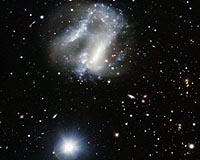 Paris, France (SPX) Mar 18, 2009 The ESO Very Large Telescope has taken the best image ever of a strange and chaotic duo of interwoven galaxies. The images also contain some surprises - interlopers both far and near. Sometimes objects in the sky that appear strange, or different from normal, have a story to tell and prove scientifically very rewarding. This was the idea behind Halton Arp's catalogue of Peculiar Galaxies that appeared in the 1960s. One of the oddballs listed there is Arp 261, which has now been imaged in more detail than ever before using the FORS2 instrument on ESO's Very Large Telescope. The image proves to contain several surprises. Arp 261 lies about 70 million light-years distant in the constellation of Libra, the Scales. Its chaotic and very unusual structure is created by the interaction of two galaxies that are engaged in a slow motion, but highly disruptive close encounter. Although individual stars are very unlikely to collide in such an event, the huge clouds of gas and dust certainly do crash into each other at high speed, leading to the formation of bright new clusters of very hot stars that are clearly seen in the picture. The paths of the existing stars in the galaxies are also dramatically disrupted, creating the faint swirls extending to the upper left and lower right of the image. Both interacting galaxies were probably dwarfs not unlike the Magellanic Clouds orbiting our own galaxy. The images used to create this picture were not actually taken to study the interacting galaxies at all, but to investigate the properties of the inconspicuous object just to the right of the brightest part of Arp 261 and close to the centre of the image. This is an unusual exploding star, called SN 1995N, that is thought to be the result of the final collapse of a massive star at the end of its life, a so-called core collapse supernova. SN 1995N is unusual because it has faded very slowly - and still shows clearly on this image more than seven years after the explosion took place! It is also one of the few supernovae to have been observed to emit X-rays. It is thought that these unusual characteristics are a result of the exploding star being in a dense region of space so that the material blasted out from the supernova ploughs into it and creates X-rays. Apart from the interacting galaxy and its supernova the image also contains several other objects at wildly different distances from us. Starting very close to home, two small asteroids, in our Solar System between the orbits of Mars and Jupiter, happened to cross the images as they were being taken and show up as the red-green-blue trails at the left and top of the picture. The trails arise as the objects are moving during the exposures and also between the exposures through different coloured filters. The asteroid at the top is number 14670 and the one to the left number 9735. They are probably less than 5 km across. The reflected sunlight from these small bodies takes about fifteen minutes to get to the Earth. The next closest object is probably the apparently bright star at the bottom. It may look bright, but it is still about one hundred times too faint to be seen with the unaided eye. It is most likely a star rather like the Sun and about 500 light-years from us - 20 million times further away than the asteroids. Arp 261 itself, and the supernova, are about 140 000 times further away again than this star, but still in what astronomers would regard as our cosmic neighbourhood. Much more distant still, perhaps some fifty to one hundred times further away than Arp 261, lies the cluster of galaxies visible on the right of the picture. There is no doubt, however, that a much more remote object lies, unrecognised, amongst the faint background objects seen in this marvellous image. Related Links ESO Stellar Chemistry, The Universe And All Within It