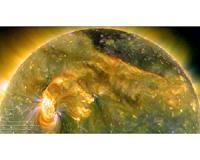 Washington DC (SPX) Aug 09, 2010 On August 1st, almost the entire Earth-facing side of the sun erupted in a tumult of activity. There was a C3-class solar flare (white area on upper left), a solar tsunami (wave-like structure, upper right), multiple filaments of magnetism lifting off the stellar surface, large-scale shaking of the solar corona, radio bursts, a coronal mass ejection and more. This multi-wavelength (211, 193 and 171 Angstrom) extreme ultraviolet snapshot from the Solar Dynamics Observatory (SDO) shows the sun's northern hemisphere in mid-eruption. Different colors in the image represent different gas temperatures ranging from ~1 to 2 million degrees K. Another great image from the Solar Dynamics Observatory (SDO) of the news-making solar event on August 1, 2010 resulting in two Coronal Mass Ejections (CMEs) launched in Earth's direction. Geomagnetic activity resulting from the coronal mass ejection (CME) on August 1st has subsided to low levels and the aurora show of August 3rd and 4th has come to an end. At the height of the display, Northern Lights descended as far south as Wisconsin and Iowa in the United States.