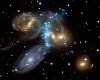 ![]() ![]() Boston MA (SPX) Jul 10, 2009 This beautiful image gives a new look at Stephan's Quintet, a compact group of galaxies discovered about 130 years ago and located about 280 million light years from Earth. The curved, light blue ridge running down the center of the image shows X-ray data from the Chandra X-ray Observatory. Four of the galaxies in the group are visible in the optical image (yellow, red, white and blue) ... read more |