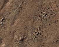 ![]() ![]() Pasadena CA (SPX) Oct 01, 2009 Spider-shaped features in the south polar region of Mars are carved by vaporizing dry ice in a dynamic seasonal process. This image from the High Resolution Imaging Science Experiment (HiRISE) camera on NASA's Mars Reconnaissance Orbiter includes several of the distinctive features in an area 1.2 kilometers (three-fourths of a mile) wide. It is one of the HiRISE camera team's featured ... read more |