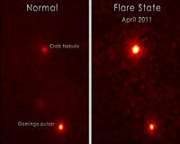 ![]() ![]() Washington DC (SPX) May 12, 2011 The famous Crab Nebula supernova remnant has erupted in an enormous flare five times more powerful than any flare previously seen from the object. On April 12, NASA's Fermi Gamma-ray Space Telescope first detected the outburst, which lasted six days. The nebula is the wreckage of an exploded star that emitted light which reached Earth in the year 1054. It is located 6,500 light-years away ... read more |