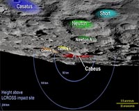 Greenbelt MD (SPX) Oct 09, 2009 At 7:30 a.m. EDT on October 9, a two-ton rocket body will slam into a crater near the moon's south pole. By studying the resulting plume of gas and dust, scientists hope this grand experiment will confirm the presence of ice in permanently shadowed craters at the lunar poles. The event is the highlight of NASA's Lunar Crater Observation and Sensing Satellite (LCROSS) mission. The LCROSS spacecraft flies behind its empty upper stage, which is targeted to strike the floor of Cabeus crater. LCROSS will image the impact and provide direct measurements of the plume before it also plunges into the lunar surface. With LCROSS gone, further measurements of the cloud depend on ground-based observatories around the world. "This is a completely unique mission that will excavate two large holes dozens of meters across on the lunar surface. It will give us composition measurements we wouldn't otherwise be able to get," said Tim McClanahan, a scientist at Goddard Space Flight Center in Greenbelt, Md. McClanahan's modeling of the moon's permanently shadowed regions, initially done to support the Lunar Exploration Neutron Detector (LEND) instrument aboard NASA's Lunar Reconnaissance Orbiter (LRO), underscored a problem for ground-based follow-up of the LCROSS impact. "We realized that ground observers would have difficulty identifying the location," he said. "It's near the lunar south pole, where illumination is poor and the ability to distinguish nearly edge-on craters is problematic. On top of that, LCROSS will hit the crater floor, but we can only see its rim from Earth." To provide the detailed information ground-based telescopes needed, McClanahan approached Goddard's Scientific Visualization Studio (SVS). The goal was to find a "sweet spot" where factors such as lunar topography, lighting from the sun, and the view from Earth provided the earliest, highest-contrast view of the rapidly changing plume. "Visualization aided two aspects of the LCROSS mission," said Ernie Wright at the SVS. "It helped us understand how visible the plume will be from Earth and whether the targeted terrain was flat and in shadow." The project prefers a crater floor because slopes tend to be rocky, whereas lighter, fluffier materials fall to the lowest elevations. "LCROSS scientists want to send up a debris cloud as high as they can," Wright explained, "so they want to hit these light materials." Scientists think that hydrogen detected in lunar soil by several instruments, including LEND, may be either icy leftovers from ancient comet impacts or accumulated from the solar wind, a stream of particles flowing from the sun. Whatever its source, scientists assume hydrogen collects in low polar elevations where the sun never shines. This dictates an impact in the shadowed portion of a crater floor. On September 11, LCROSS mission planners announced that they had targeted a smaller, more northerly crater named Cabeus A. But later that month, analyses of new data from instruments aboard LRO, together with archival measurements from NASA's Lunar Prospector mission of the late 1990s, indicated that the larger Cabeus crater was a better bet. "The sweet spot for ground-based telescopes lies about two kilometers above the floor of Cabeus," Wright explained. "There, sunlight streaming through a depression in the crater rim will light up the plume while the rest of the crater remains in shadow." Share This Article With Planet Earth