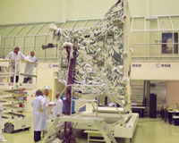 The installation of high-temperature thermal blankets on the Structural and Thermal Model of the BepiColombo Mercury Planetary Orbiter has been completed. The spacecraft has been mounted on its Thermal Test Adapter and transferred to the Large Space Simulator in preparation for thermal-balance testing. The high-temperature thermal blankets were installed first on the +Z (Nadir) side of the Mercury Planetary Orbiter (MPO). On 8 August, the spacecraft was removed from its ground handling trolley using an overhead crane equipped with a special lifting adapter and rotated through 180 degrees about its Y-axis. It was then mounted on the ground handing trolley via its -Z (top, in launch configuration) face, to enable technicians to access the +Z face for thermal hardware installation. Once the spacecraft had been rotated using the crane, the ground handling trolley rotated it so that its Z-axis was vertical, enabling the crane to lift the mounting adapter off of the +Z face once it had been unbolted. Over the following three weeks, the remaining thermal blankets were installed. To cope with the extreme thermal conditions in Mercury orbit, the MPO is fitted with two sets of thermal insulation blankets. The inner blanket, which appears metallic in the images, is a conventional Multi-Layer Insulation (MLI) with 10 layers. The high-temperature blankets (white in the images) that have now been installed have in total more than 20 layers made of different materials. The outer blankets employ a special fastening technique to avoid holes through the blanket and the protrusion of stand-offs that might be illuminated by the Sun. To minimise conductive coupling between the two blankets, they are kept 15 mm apart and their facing surfaces are highly reflective, to minimise radiative coupling. The outer layer of the high-temperature blankets is made from electrically non-conducting fabric; to control the build-up of electrostatic charge on the surface of the spacecraft, conducting threads have been woven through the outer layer every 10 cm. The separate parts of the outer blanket were hand-sewn together once they had been installed. On the weekend of 27/28 August, after completion of the blanket installation, the MPO was removed from its ground handling trolley and installed on its Thermal Test Adapter (TTA). As the spacecraft heats up during thermal-balance testing, it will expand. If it were rigidly mounted to the interface in the Large Space Simulator (LSS), this expansion would give rise to large mechanical stresses. Instead, the TTA connects the MPO to the LSS interface through four bipods that are allowed to move and relieve the mechanical stresses. On the afternoon of 31 August the MPO and TTA were moved into the LSS. Once additional preparations have been completed, thermal-balance testing is scheduled to commence towards the beginning of week 37. Related Links BepiColombo Mercury Planetary Orbiter News Flash at Mercury Mars News and Information at MarsDaily.com Lunar Dreams and more