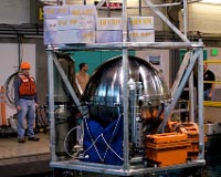 Moffett Field CA (SPX) Jun 17, 2009 The deep ocean is not a well-understood environment. It has been only 30 years since hydrothermal vents, and the zoo of bizarre creatures that inhabit them, were first discovered on the Pacific seafloor near the Galapagos Islands. Before that time, the consensus among scientists was that Earth's ocean depths were dead zones. Since then, however, hydrothermal vent systems around the world have been catalogued and studied. Submersible vehicles have done much of this exploration, some of them piloted by humans, others operated remotely. But studies of deep-ocean environments have been brief, episodic. They have allowed scientists to obtain snapshots of what goes on in there, but not to understand it dynamically. What, for example, happens when a new hydrothermal vent first erupts on the seafloor? How does the water chemistry change? Which organisms appear first? How does the biological community develop over time? The Deep-ESP project - ESP stands for Environmental Sample Processor - is designed to begin answering these questions, to study how deep-sea ecosystems respond over time to changes in environmental conditions. Developed by a group of scientists and engineers at the Monterey Bay Aquarium Research Institute (MBARI) in Moss Landing, California, and funded in large part by NASA's ASTEP (Astrobiology Science and Technology for Exploring Planets) program, Deep-ESP recently began a new round of field tests. In these experiments, Deep-ESP will descend to sites as deep as 1800 meters (5900 feet) and, in its final test, will be left on the seafloor for a year, operating without human intervention, monitoring the environment for signs of sudden changes in temperature or water chemistry, then springing into action to study the resulting shifts in the biological community. Deep-ESP has two major components: a core, responsible for performing sophisticated DNA and other biological analyses; and a deep-water-sampling unit, responsible for collecting ocean water, depressurizing it and passing it through the core. Deep-ESP has been in development for several years, but it recently underwent a major upgrade. In its current configuration, the core remains unchanged, but the enclosure that houses it is completely new. The new enclosure is a shiny titanium sphere. The earlier pressure housing was a long cylinder weighing about 950 pounds, but it was designed for use only to a depth of about 1000 meters. A cylindrical housing the same size, capable of withstanding the pressure at 1800 meters, would have required walls two inches thick, resulting in a device weighing nearly a ton. In contrast, the new pressure housing, a titanium sphere some 40 inches in diameter, will allow the ESP to travel to depths up to 4000m, over 2 miles below the ocean surface where the pressure is 6000 pounds per square inch. Yet it weighs only 900 pounds, and "has three times the volume inside," said Doug Pargett, the MBARI engineer who designed the sphere. The extra room can be used to mount custom analytical modules inside the sphere. In late April and early May, the spherical model of the Deep-ESP took its first dip in the Pacific Ocean, at a site in Monterey Canyon, about 10 miles off the coast of central California, at a comparatively shallow depth of 650 meters. In its new configuration, the instrument was designed to work as an "elevator," deep-sea-research lingo for a device that descends and returns to the surface on its own. Attached to the bottom of the cage in which the sphere was mounted was a 600-pound steel bar, which made the ESP sink to the bottom. When its underwater operation was completed, the weight was dropped, and the sphere floated to the surface. Actually, this elevator function, new to the spherical ESP, was part of the recent test. The earlier, cylindrical ESP was carried to the ocean floor and returned to the surface by MBARI's ROV Ventana. Ventana did, however, play a role in testing the sphere, as well. The surface of the sphere contains a "wet-mate" connector, for making underwater network connections. Once the Deep-ESP reached the bottom, Ventana, tethered electronically to the ship via a long fiber-optic cable, was sent down to plug into the device. "Literally we plug into the machine and then we can talk to it just as if you had a hardwire Internet connection to it," said MBARI's Chris Scholin, principal investigator for the project. Engineers onboard the ship then feed the instrument instructions to perform various tasks. The deep-water sampling unit, also newly designed since the previous series of field tests, is capable of sucking in a maximum of 10 liters of water. In the recent maiden voyage it acquired only 2 liters. The sampling unit then depressurized the seawater, before passing it through the core. Surface-level pressure is maintained inside the sphere; if high-pressure deep-sea water were passed directly through the core, it would destroy the instrument. The entire volume of collected water was passed into the core, through a filter and back out. The good stuff, the material the scientists are interested in, is what stayed behind on the filter. It's a tiny amount. "Imagine a filter that's discolored," said Scholin. "We're not talking like a big dome" of material, "it's just sort of like the filter's stained." But that's where all the biology is to be found. That material was then dissolved and homogenized, using various chemical reagents contained in bags of fluid within the core. The end result was about two milliliters of "this concentrated extract, this dirty dishwater," said Scholin. "We started with two liters of liquid, and we end up with two milliliters," he said, "about a thousand to one reduction." In the final step, this concentrate was fed to the DNA-analysis module of the core, which, after a series of additional biochemical reactions, produced an array of tiny fluorescing dots, each dot representing the presence of a particular organ