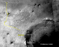Opportunity is making excellent progress towards Endeavour crater with only 2.3 kilometers (1.4 miles) to go before reaching the first landfall on the rim, a place called "Spirit Point." The rover drove southeast on four sols, Sols 2629, 2630, 2633 and 2634 (June 17, 18, 21 and 22, 2011), totaling more than 380 meters (1,247 feet). With all this driving, which requires many seconds on the rover's inertial measurement unit (IMU), regular sun finds, called Quick Fine Attitudes (QFA) are performed to correct for expected drift in the rover's gyros. A QFA was performed on Sol 2633 (June 21, 2011). Over the three-sol weekend plan, an overnight Alpha Particle X-ray Spectrometer (APXS) measurement of atmospheric argon was performed on Sol 2631 (June 19, 2011). With the improve energy production from cleaner solar arrays, on Sol 2634 (June 22, 2011), an early morning wakeup for an AM ultra-high frequency (UHF) relay pass was implemented to return more data from the rover. As of Sol 2634 (June 22, 2011), solar array energy production was 505 watt-hours with an atmospheric opacity (Tau) of 0.926 and a solar array dust factor of 640. Total odometry is 31,203.25 meters (31.20 kilometers, or 19.39 miles).