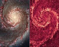 ![]() ![]() Boston MA (SPX) Jan 14, 2011 These images by NASA's Hubble Space Telescope show off two dramatically different face-on views of the spiral galaxy M51, dubbed the Whirlpool Galaxy. The image at left, taken in visible light, highlights the attributes of a typical spiral galaxy, including graceful, curving arms, pink star-forming regions, and brilliant blue strands of star clusters. In the image at right, most of t ... read more |