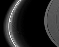 ![]() ![]() Pasadena CA (SPX) Nov 26, 2009 The diminutive moon Prometheus whips gossamer ice particles out of Saturn's F ring in this image taken by the Cassini spacecraft on Aug. 21, 2009. The moon and the ring have eccentric, offset orbits, so Prometheus dips in and out of the F ring as it travels around Saturn. Its gravitational force drags the dust-sized particles at the edge of the F ring along for the ride. ... read more |