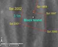 ![]() ![]() Pasadena CA (SPX) Sep 21, 2009 Opportunity completed the circumnavigation and full-circle imaging of the large meteorite "Block Island" and has resumed the long drive to Endeavour crater. On Sol 2001 (Sept. 9, 2009), the rover moved 9 meters (30 feet) around the meteorite to the fourth and fifth out of six planned positions. On the next sol Opportunity reached the sixth and final position around Block Island with ... read more |